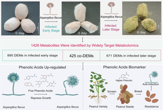 本研究为后续开展花生抗黄曲霉侵染提供了代谢组的基础数据,研究结果表明花生制品中添加酚酸类化合物能够抑制黄曲霉生长。此外,培育抗黄曲霉品种,需要用不同的花生品种大量接种黄曲霉菌,不仅是对研究人员的伤害,也会在环境中释放黄曲霉孢子。通过本研究结果,我们可以培育出高酚酸兼抗黄曲霉的花生新品种,我们只需要检测酚酸含量高的花生品种,或检测酚酸Biomarker含量高的品种,无需接种黄曲霉菌,即酚酸含量越高的花生,兼抗黄曲霉菌侵染的能力越强。