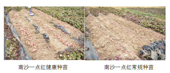 培训会后,专家现场进行田间产量测定,并开展了机械化采收现场示范,随着一垄垄甘薯被翻开,种植户们纷纷对健康种苗技术的成效表示认可,陈博治指出,“健康种苗的应用改变我对南沙一点红的认知,现在一垄红薯可以抵原来两垄,且商品薯率高,原来有一半以上都是小薯或病薯,现在满眼看去都是商品薯,且薯形很漂亮,健康种苗的使用撕掉了南沙一点红低产的标签”。专家测产验收结果显示,南沙一点红健康种苗种植产量为4515.38斤/亩,商品薯率高达89.30%,常规种苗1927.14斤/亩,商品薯率仅为66.43%,专家一致认为健康种苗对南沙一点红具有极大提升作用,值得大面积推广应用。