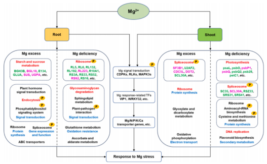 华南地区镁养分缺乏已成为作物产量和品质提升的关键限制因子。本研究解析了烟草根系与地上部,分别响应镁营养缺乏和过量供应的生理代谢机制。研究结果显示适宜的镁水平供应显著提高烟株对氮、磷以及钾营养的利用效率,在维持烟草细胞的离子稳态、养分信号转导,进一步促进烟株生长发育具有重要作用。同时,该研究也揭示了镁营养参与的烟草生长发育过程中的转录、蛋白、翻译后(磷酸化)调控途径。该研究将为华南植烟区域合理施镁增效,解决烟叶丰产不优质的突出问题提供理论支撑。