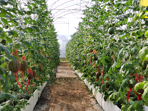 根据西瓜甜瓜生理特性,在设施大棚内采用专用品种、有机基质、水肥营养及轻简管理技术,大幅提高设施空间和水肥等利用率,生产优质高产的西瓜甜瓜产品。该技术适合在山坡和丘陵等非耕地发展高档设施西瓜甜瓜产业,解决果粮争地的矛盾,提高土地生产率。