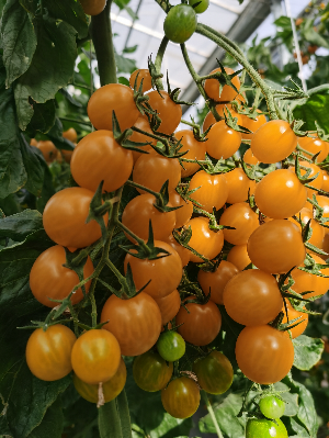 粤科达101:无限生长型,长势强,多岐花序为主,未成熟果有绿肩,成熟果实为黄色,果型圆,萼片直,可溶性固形物9.5%以上,风味佳,裂果少,耐储运,单果重约18g,可穗收,高产,适宜设施和露地栽培。该品种综合品质达到国外高端樱桃番茄品种水平,目前已在广东、广西、云南、福建、海南、浙江、山东、陕西、西藏、黑龙江、贵州等地推广种植,适应范围广,经济效益好。入选2021年、2022年和2023年广东省农业主导品种。