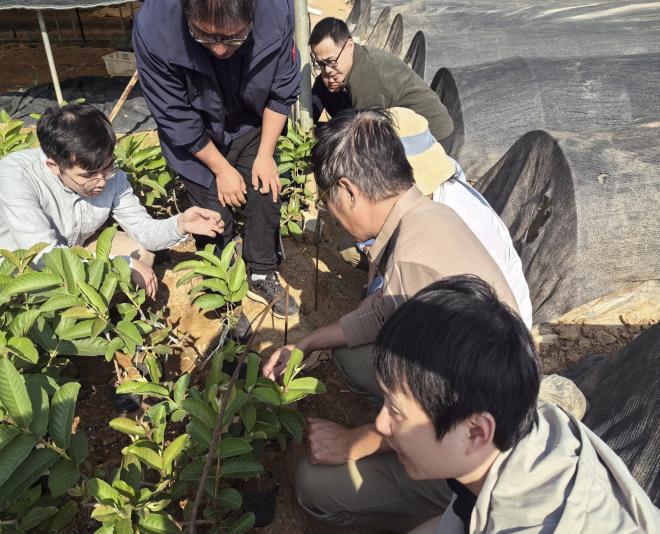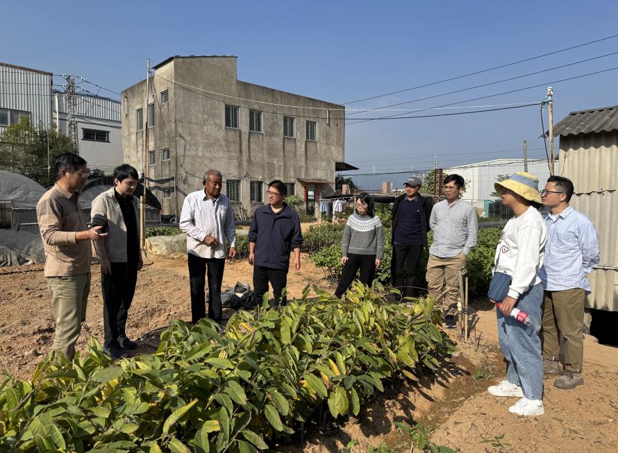 此次科技下乡活动由“百千万工程”农村科技特派员蔡茜茜青年副研究员带队,环艺所秦红杰研究员、吴昊平副研究员、尤毅副研究员、叶广英助理研究员、李建颖研究实习员,以及亚洲足球体育博彩平台 果树所的肖维强研究员、广东工业大学的王逸副教授和华南师范大学的陈振国特聘研究员等一行9人组成团队。团队先后前往益农果苗厂、省“百千万工程”首批典型村—坛头村等地实地调研,随后与盐鸿镇副镇长陈复燃、驻盐鸿镇工作队队长田学志以及镇农办陈哲海主任等领导进行深入交流。
