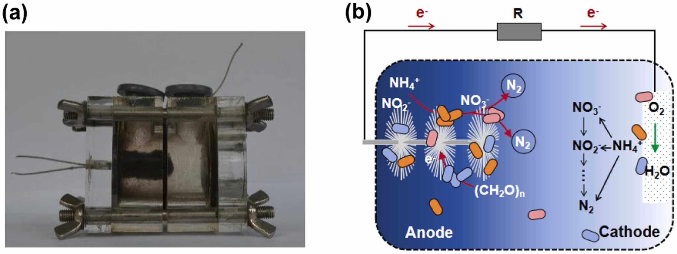 电-厌氧氨氧化技术已被证实可提升废水处理中的厌氧氨氧化反应效率,但其生物膜形成的影响因素,尤其是进水C/N比的作用机制仍缺乏系统研究。为此,研究团队设计了生物电化学系统,通过选择性富集电-厌氧氨氧化生物膜,探究了C/N比对生物膜脱氮性能、氧化还原活性及微生物群落组成的影响。