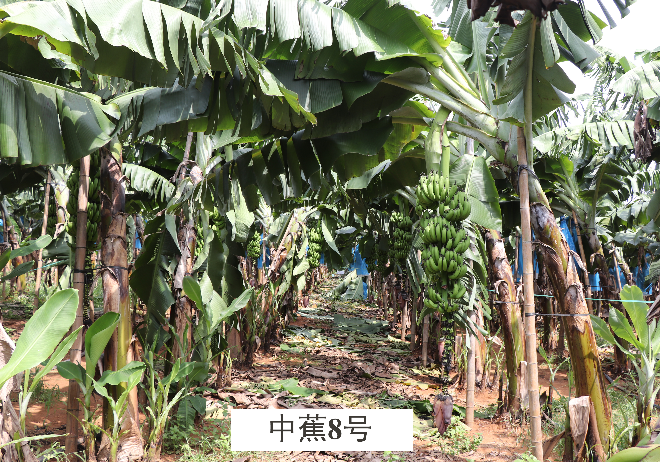 产量与效益优势:中蕉8号香蕉新品种平均株产为25.3kg/株,新植蕉园产量可达3036千克∕亩;宿根蕉园产量达3228千克∕亩,种植效益好。