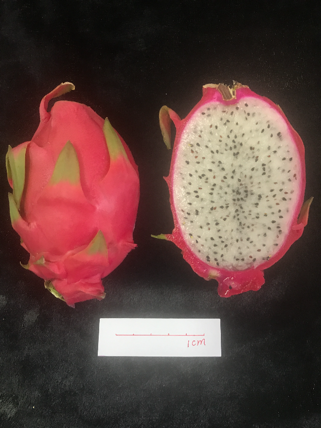 品种优势:果实长椭圆形,平均单果重310克;果皮鲜红,成熟时鳞片中上部绿色;果肉白色,肉质爽滑、清甜,可溶性固形物含量14.1%。粗生易管,成花坐果能力强,早结丰产稳产,自交结实率高;克服了成熟果实鳞片尖部易干枯萎蔫、果肉带有青草味的缺点,品质优,大小均匀,商品性好。