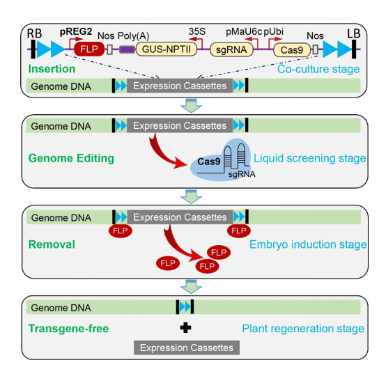 本研究是基于前期建立的CRISPR/Cas9基因组编辑技术,进一步在香蕉中建立了高效的无转基因残留基因组编辑技术体系。通过将基因组编辑元件和基因清除元件整合在同一载体上,以香蕉胚性悬浮系为受体材料,进行农杆菌介导的遗传转化,能实现在靶位点发生基因组编辑后对引入的功能基因成分进行删除,整个过程无需进行额外处理。此技术体系的建立为香蕉基因组编辑技术的产业应用奠定了基础。