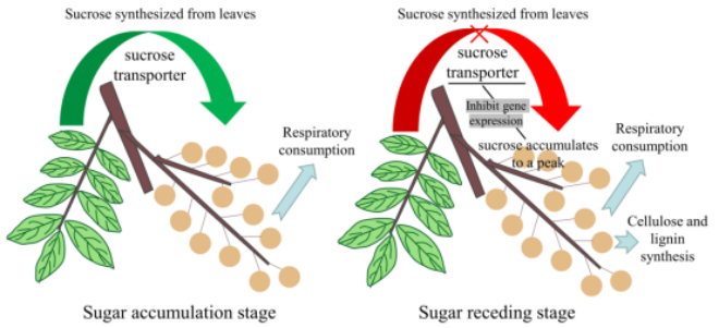 龙眼(Dimocarpus longan Lour.)是我国南方主要的亚热带果树之一,其果实存在完全成熟后糖度快速下降的现象,导致品质降低、不耐贮运。据统计我国每年约有1/4鲜食龙眼受“退糖”问题困扰,严重影响产业经济效益。本研究通过对不同发育时期龙眼果肉转录组、代谢组联合分析,发现糖酵解途径相关基因在果实开始成熟时表达量已经较高,并在糖含量维持和退糖阶段依然保持较高表达水平,而UDP-glucose呈减少趋势,向纤维素转化。研究结果表明,在龙眼退糖阶段,果实中糖的主要去向是呼吸消耗,部分合成纤维素、木质素,在糖积累至退糖阶段,呼吸消耗相关基因表达一直处于较高水平,据此推断呼吸消耗不是导致蔗糖含量骤降的主要原因,进而推测:叶片合成的糖在糖积累阶段通过糖转运蛋白转运到果肉中,在糖积累到一定程度后,形成负反馈调节,降低蔗糖转运蛋白相关基因表达,停止蔗糖继续转运到果肉,输入中断,但糖消耗依然持续保持在较高水平,从而导致蔗糖含量骤降,发生“退糖”现象。
