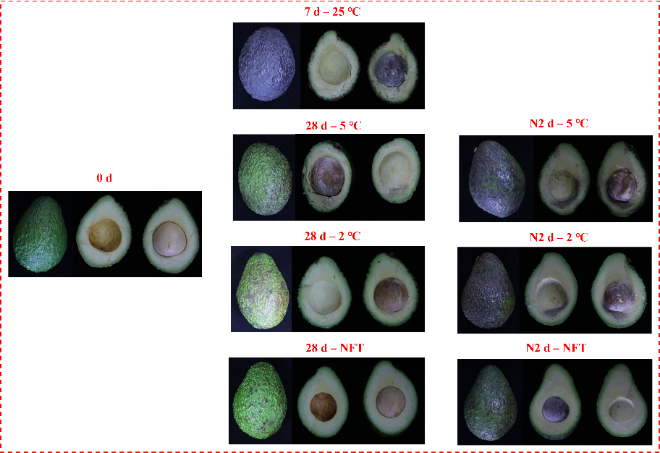 油梨果实在不同保鲜温度下贮藏0、28和N2 d的形态特征