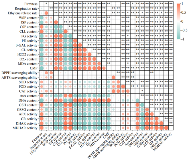 油梨果实品质、活性氧代谢和细胞壁代谢指标的相关性分析