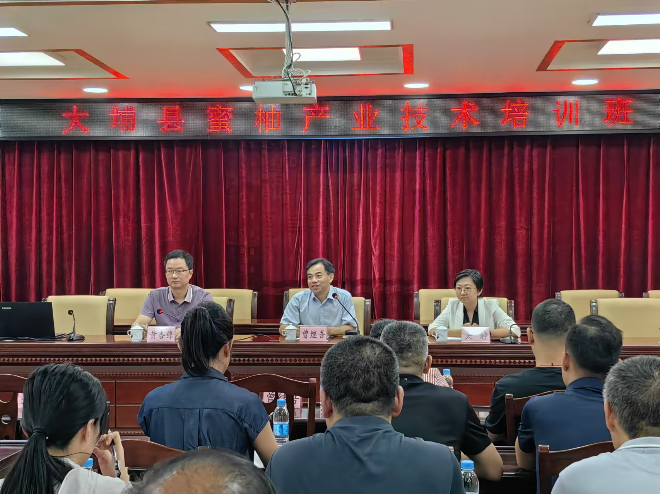 蜜柚产业高质量发展技术培训会由大埔县农业农村局局长黄杏锋主持,大埔县委副书记、“百千万工程”帮扶协作驻大埔县工作队队长吴静出席会议并作动员讲话。在培训会上,曾继吾为当地农业服务中心干部、柚农分析了大埔蜜柚产业优势和存在的问题,希望大家重视果园日常管理,注重果园肥水精准管控、树体管理、病虫害综合防控及采后贮运保鲜等技术落实,实现蜜柚品质大幅提升,同时,一定要培育壮大品牌,全面推动大埔蜜柚产业高质量发展。随后,与会专家围绕蜜柚土壤改良与施肥、柚类主要病虫害发生及防治、柚果适时采收及采后处理、秋冬季果园管理等技术开展主题培训;这次培训会,特邀深圳百果园实业(集团)股份有限公司采购部门负责人黄龙先生进行授课,他从果品销售和市场信息等方面,比较详细介绍了蜜柚采购需求、优质果采购标准和市场终端销售等内容,大家受益匪浅。