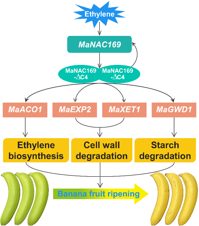 香蕉既是重要热带水果也是世界第四大粮食作物,其果实采后不耐贮运导致采后损失大,严重制约着产业健康发展。深入解析香蕉采后成熟调控机制对于进行定向分子育种具有重要意义。本研究新鉴定出一个具核与质膜双定位的NAC转录因子,其受乙烯高度诱导表达,且与果实后熟过程呈正相关,暗示其可能参与果实成熟调控。进一步研究发现,该转录因子在乙烯的诱导下以核定位形式发挥作用,通过直接结合并正调控多个细胞壁降解相关基因的表达,从而参与调控果实后熟过程。