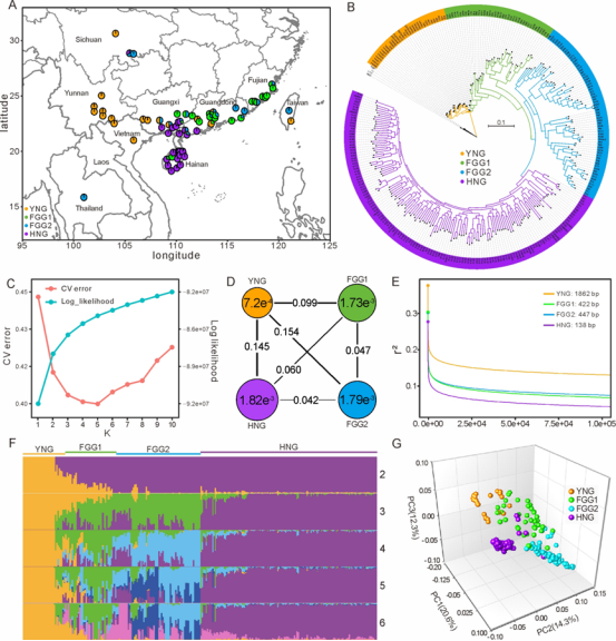 在本研究中,对来自国家荔枝种质资源圃(广州)从全球收集的276份具有代表性荔枝种质资源进行了重测序,构建了迄今为止荔枝(乃至整个无患子科)最全面的遗传变异图谱。通过对21个果实品质相关性状进行表型分析,进一步结合全基因组关联研究,鉴定了总计460个与果实性状显著相关的SNP和1,807个候选基因。利用高效液相色谱(HPLC)方法测定了190个荔枝品种果实的糖组分和含量,通过比较LcSAI蔗糖和还原糖种质中的差异,开发了一个与糖组分和含量紧密连锁的分子标记,可用于荔枝育种的早期筛选,缩短育种周期。本研究揭示了荔枝的遗传多样性和群体结构,通过全面的基因组分析和表型分析,阐明了果实品质的遗传基础。