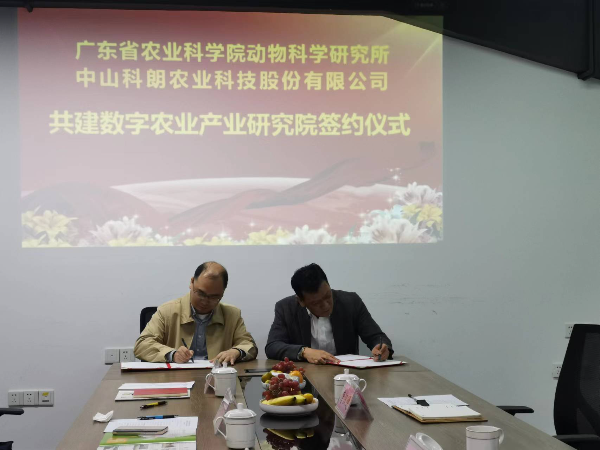 11月17日,动科所家禽营养与饲料研究室与中山科朗集团公司举行了“数字农业产业研究院”共建签约仪式。动科所所长罗成龙、副所长马现永、技术合作与推广中心主任张厂、家禽营养与饲料研究室主任蒋守群、科朗集团公司董事长郑秋煊、常务副总裁解飚、行政总监冯爱芬等出席仪式。