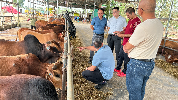 在驻镇帮镇扶村工作队的陪同下,张志飞博士一行对覃巴镇黄牛养殖、生猪养殖、砂糖橘种植等特色产业的经营主体进行了调研和技术推广服务,并实地观摩了覃巴镇示范村新村的秋收工作。