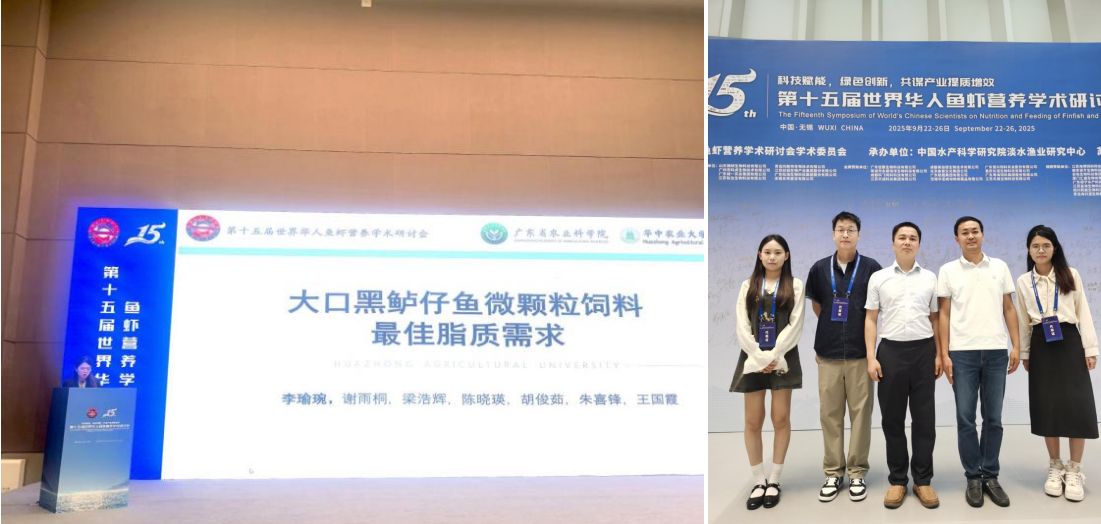 9月22—26日,动科所(水产所)水产研究室彭凯研究员率团队赴无锡参加第十五届世界华人鱼虾营养学术研讨会(以下简称“世华会”)。彭凯受邀作题为“植物缩合单宁的制备及其抗逆性评价”的口头报告,分享了植物缩合单宁的资源开发及对鱼虾抗逆作用机制的创新研究工作。联合培养硕士生李瑜婉在研究生论坛上汇报了“大口黑鲈仔鱼微颗粒饲料最佳脂质需求”的研究进展。