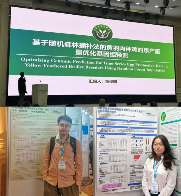会议期间,团队成员联合培养的硕士研究生通过口头报告与壁报展示,系统呈现了家禽领域最新研究进展。蓝俊图(广东海洋大学)在家禽遗传育种研究分会场作了题为“使用随机森林插补法优化黄羽肉种鸡产蛋量时间序列数据的基因组预测”的口头报告,系统介绍了主流缺失数据处理方法用于黄羽肉鸡缺失产蛋时间序列数据插补的基因组遗传评估研究结果;戴洋(佛山大学)与牛开元(安徽农业大学)通过壁报展示了黄芩黄酮和栀子对肉鸡生长性能、免疫功能和肠道健康的改善作用。