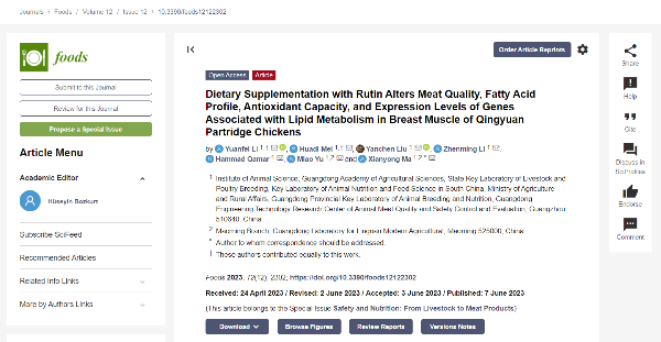 近日,动科所生态养殖与环境控制研究团队在国际学术期刊Foods(JCR一区,IF=5.60)发表题为“Dietary Supplementation with Rutin Alters Meat Quality, FattyAcid Profile, Antioxidant Capacity, and Expression Levels ofGenes Associated with Lipid Metabolism in Breast Muscle ofQingyuan Partridge Chickens”的研究论文。李袁飞博士后为文章的第一作者,马现永研究员为论文的通讯作者。