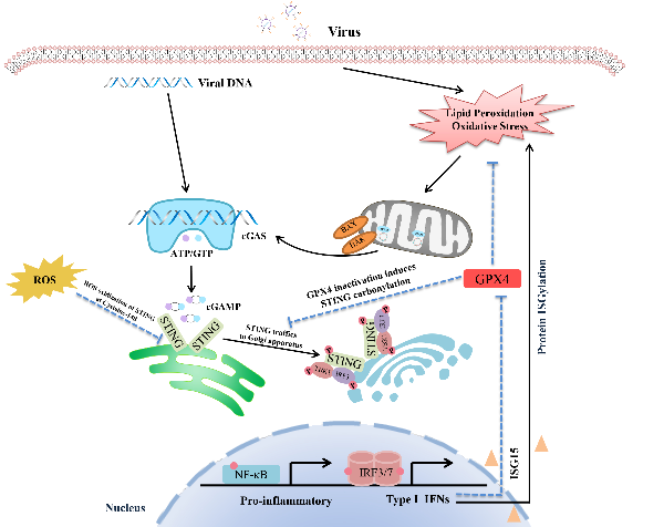 整合多组学和分子功能分析结果发现,cGAS-STING通路可以调控宿主免疫细胞应答并调控病毒感染。除了最常见的调节炎症和 I 型干扰素功能外,cGAS-STING 信号轴与一系列细胞反应密切相关,其中包括氧化应激、自噬和内质网应激。这些反应对宿主免疫生理稳态都有重大影响。此外,这些宿主细胞反应在调控 cGAS-STING 信号轴和清除病毒方面发挥着还“双刃剑”作用。了解cGAS-STING介导的潜在抗病毒功能不仅有助于揭示DNA病毒感染的发病机制,也为抗病毒治疗提供有效的解决方案,还可以为农业动物抗病育种提供新靶点。