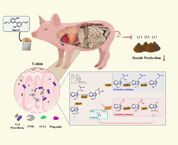 本研究揭示了厚朴酚从源头降低粪臭素排放的分子机制。通过饲养试验发现厚朴酚显著降低了结肠和粪便中粪臭素的含量,同时发现粪臭素的含量和Desulfovibrio呈正相关;分子对接模型表明,厚朴酚可以很好的与吲哚丙酮酸脱羧酶(Desulfovibrio)结合;体外试验结果进一步表明,厚朴酚能够靶向结合吲哚丙酮酸脱羧酶,从而减少流入粪臭素生成途径中的中间代谢物。本研究结果为养殖业臭气源头减排提供了新的思路和途径。