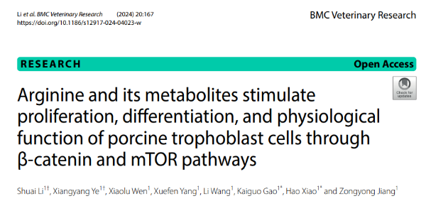 近日,动科所猪营养团队在国际学术期刊BMC Veterinary Research(中科院二区期刊)发表题为“Arginine and its metabolites stimulate  proliferation, differentiation, and physiological  function of porcine trophoblast cells through β-catenin and mTOR pathways”的论文。联合培养研究生李帅,叶翔杨为文章的共同第一作者,高开国研究员及肖昊副研究员为论文的通讯作者。