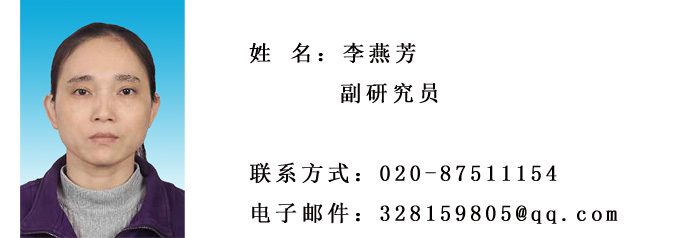 李燕芳,广东省佛山市人,农业昆虫与害虫防治硕士。从事水稻稻飞虱、水稻稻卷叶螟等为主的水稻虫害防控研究,在水稻抗虫性鉴定、水稻害虫抗性等水稻虫害综合治理技术研究与示范推广工作中积累了丰富的实践经验。近五年主持或作为主要参加者承担完成国家、省、市等各级课题10余项;发表学术论文14篇,其中SCI期刊论文3篇;获广东省农业技术推广奖一等奖1项、二等奖2项。
