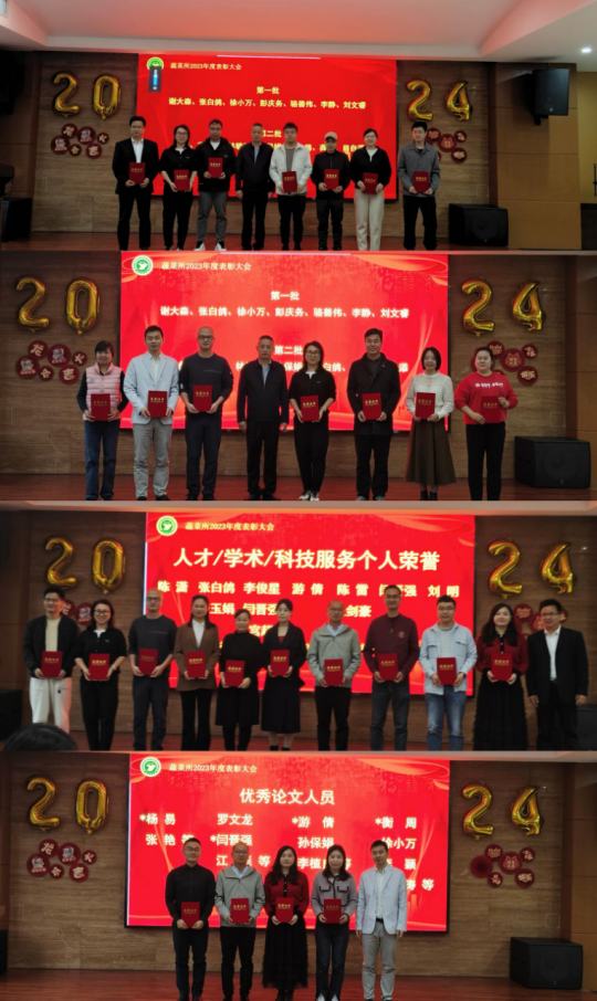 总结表彰会由所党委书记曾秀媚主持。会上,谢大森所长围绕基础研究、科技成果、科技支撑“百千万工程”、科研条件平台建设、党建与业务双融双促等方面通报了蔬菜所2023年度主要工作成效,分析了存在的短板和问题,并就2024年重点工作和努力方向进行部署。易干军对蔬菜所2023年取得的成绩表示充分肯定,并强调2024年是落实“十四五”规划的攻坚之年,要针对存在问题锚定下一步攻坚重点:一是要持续做优做强优势学科,积极争取大项目支持;二是持续强化应用基础研究,加强高层次人才的引进和青年人才的培养;三是要加大力度发展都市农业、数字农业、智慧农业等交叉学科;四是要加强对外学术交流,主动“走出去”深化合作、引进资源,促进科技创新水平提升。会议对先进集体和个人进行了表彰。易干军、所领导分别为2023年“院先进工作者”“所先进工作者”、省院地市以上科技奖励获奖代表、市/院学术、人才、群团荣誉代表、高水平论文代表等颁奖。