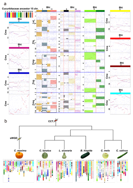 冬瓜、黄瓜、甜瓜、西瓜、葫芦、南瓜、丝瓜等瓜类作物都属于葫芦科,起源于共同的祖先,作为产品器官的果实在形态和风味上表现出丰富的多样性。本研究首次绘制了冬瓜的基因组精细图谱,含有2万7千多个基因,重复序列的大量扩增导致其基因组比其它瓜类作物大2-3倍。通过比较基因组学研究,发现冬瓜是所有已知瓜类作物中保留最多祖先基因状态的最保守作物,以此推断出所有瓜类作物起源于一个拥有15条染色体的祖先基因组,经过多次断裂和融合等事件形成了目前丰富多彩的瓜类作物。