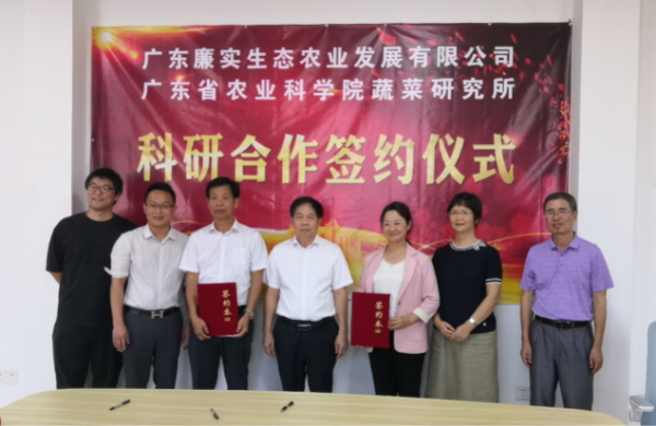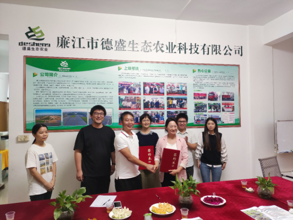 广东廉实生态农业发展有限公司总经理陈正球、廉江市德盛生态农业科技有限公司总经理苏钢及廉江市田头汇农业科技有限公司总经理杨炳尧分别介绍公司发展历程、种植基地运行模式、生产销售情况和产业技术需求。尹艳介绍了我所科技服务产业、主推品种、主导技术情况,并结合当下生产实际提出了可行性建议。随后,我所与广东廉实生态农业发展有限公司等3个公司签订了共建科技成果示范基地合作协议并为科技成果示范基地揭牌。