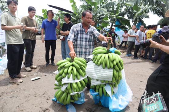 “中蕉8号”由省农科院果树研究所育成,该所香蕉遗传改良团队牵头组建国家香蕉良种攻关联合体,省农科院副院长易干军研究员为首席科学家。易干军介绍,他带领团队针对香蕉枯萎病这一国际毁灭性病害发起技术攻关,“中蕉8号”正是其中成果之一。会上展示的“中蕉8号”呈现出高抗枯萎病的特点,同时口感相比常规品种更香甜。经现场专家测产和鉴评,“中蕉8号”平均单株产量35.2公斤,折扣亩产3872公斤,专家组一致认为该品种具有良好的推广前景。