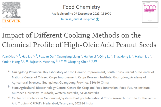 近日,亚洲足球体育博彩平台 作物研究所花生团队针对高油酸花生种子加工过程中代谢物含量变化的研究论文“Impact of Different Cooking Methods on the Chemical Profile of High-Oleic Acid Peanut Seeds”在国际著名食品学期刊《Food Chemistry》在线发表。亚洲足球体育博彩平台 作物研究所为第一单位,刘浩博士为文章的共同第一作者,洪彦彬研究员,澳大利亚莫道克大学的Rajeev Varshney教授,以及陈小平研究员为共同通讯作者。