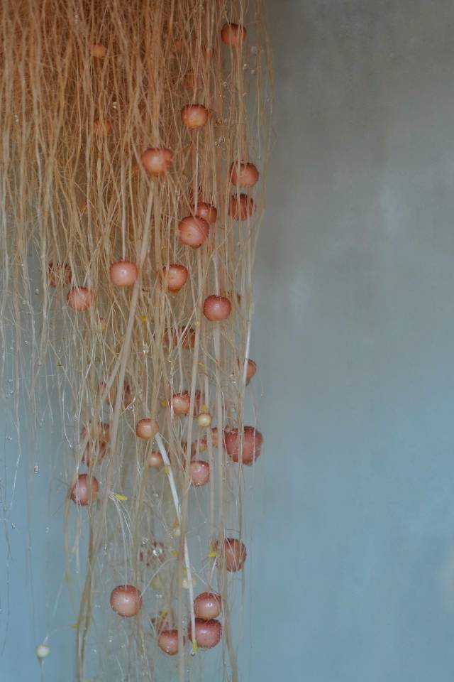 如今,李小波设计的雾培装置就设在基地的温室里。雾培床上,一株株薯苗绿意盎然。打开雾培槽下的遮光挡板,马铃薯的根须一览无余,一簇簇悬空垂下,上面结着数十粒鹌鹑蛋大小的实生薯。设定时间一到,雾化的营养液便从雾培床下的喷头内喷出,给根须上的实生薯洗起了“营养澡”。