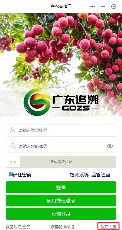 第一次登陆小程序,需要在右下角点击“账号注册”进行注册。