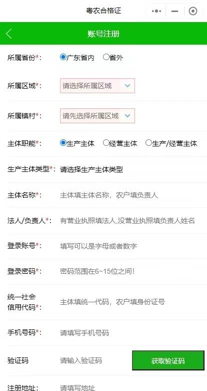填写所属区域、主体职能、生产主体类型等资料后,就可以完成注册,今后便可以直接进入开证环节。家庭农场、个体户、小农户等均可以在此开证。
