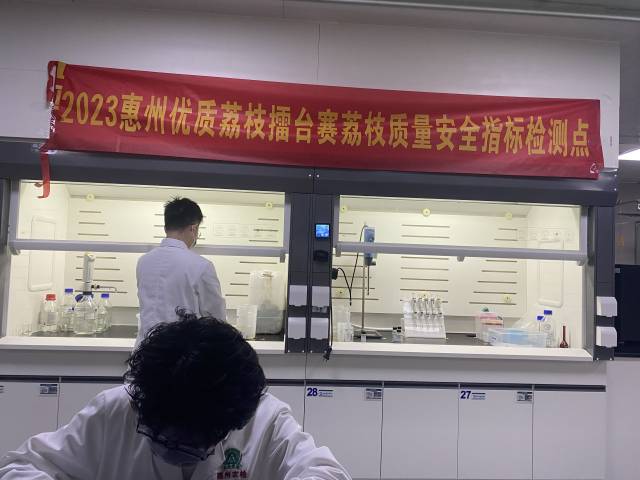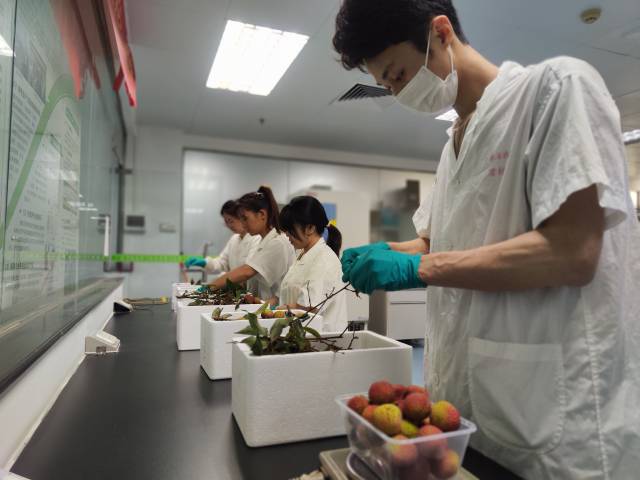 “一般来说,妃子笑荔枝外皮呈现青中透红的色泽,红色部分要占到1/2或者2/3以上,肉质口感清、爽、脆为优。”经过现场感官评审后,这些荔枝样品又被分别送至省农科院质标所和惠州市农检中心,进一步开展理化品质指标和农药残留质量安全指标检测。