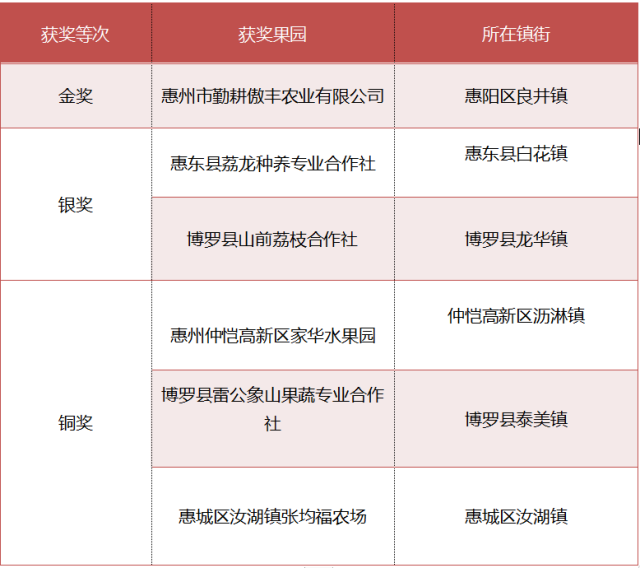 最终,经过几轮评选,惠阳良井镇选送的妃子笑荔枝获得金奖,该荔枝种植企业为惠州市勤耕傲丰农业有限公司。