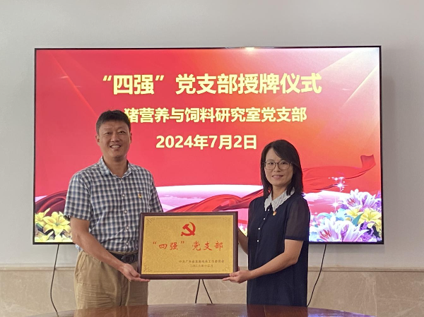 会议还举行了“四强”党支部授牌仪式,孙建新代表所党委为获得省直机关“四强”党支部的猪营养与饲料研究室党支部授牌。