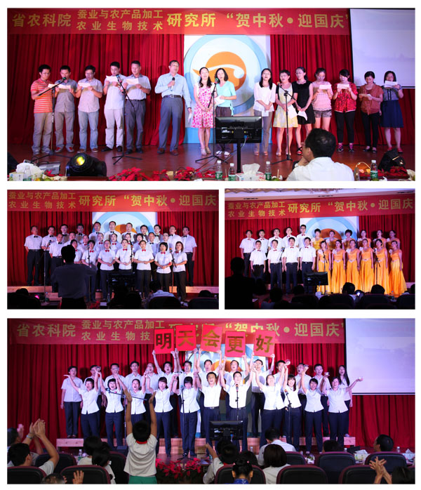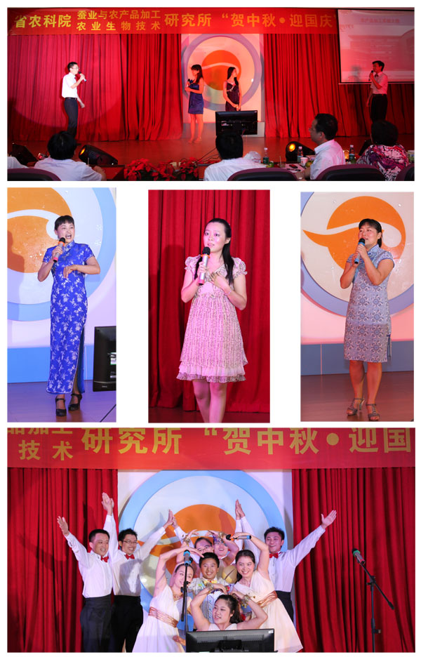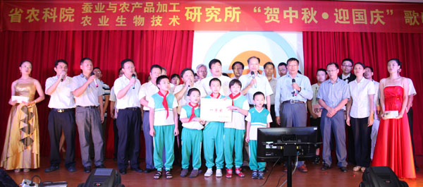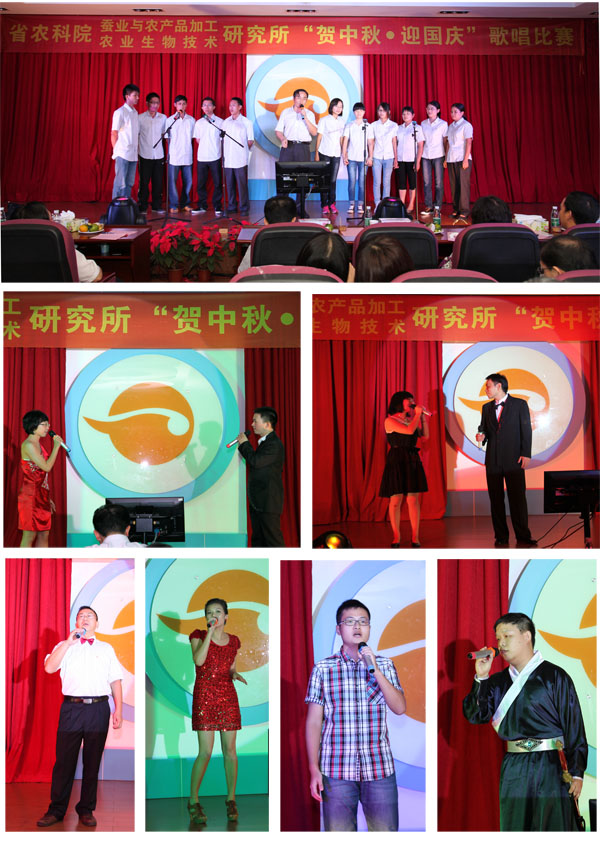 为庆贺一年一度的中秋国庆“双节”,进一步弘扬我所优良的传统文化,丰富员工的业余文化生活,省农科院我所于9月26日晚在所会议厅隆重举行了2012年“贺中秋迎国庆”歌唱比赛。院党组副书记、纪检组长、直属机关党委书记廖森泰,院党组成员、副院长肖更生,院科技管理处处长徐志宏、副处长刘建峰、刘军,院机关党委办主任庄文才、副主任张劲松,院计划财务处处长陈卫东等领导应邀莅临晚会现场,所领导班子成员、院科技管理处及机关党委办全体工作人员、我所全体职工及职工家属200多人参加了本次歌唱晚会。