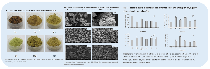 本研究以新鲜苦瓜果浆为原料,比较分析了大豆分离蛋白、阿拉伯胶、麦芽糊精、抗性淀粉以及酪蛋白酸钙大豆磷脂复合物共5种不同壁材对苦瓜喷干粉营养活性及应用特性等多维品质的影响及机制。研究发现5种壁材都可降低苦瓜喷干粉的水分含量、水分活度、褐变程度、团聚和苦味,其中酪蛋白酸钙大豆磷脂复合物在降低吸湿性的同时,对苦味表现出显著消减作用,苦味强度降低87.50%。另外,5种壁材均可提高苦瓜喷干粉黄酮、皂苷和维生素C的保留率,其中大豆分离蛋白包埋后,总黄酮保留率可达74.84%;相较于未包埋苦瓜粉,抗氧化活性和α-葡萄糖苷酶抑制活性分别提高89.08%和81.13%。酪蛋白酸钙大豆磷脂复合物包埋后总皂苷和维生素C保留率分别为74.07%和50.90%,相较于未包埋苦瓜粉,分别提高44.11%和3484.50%。研究结果可为低苦味高活性苦瓜全粉的开发提供科学指导。近年来,团队围绕特医/特膳食品专用苦瓜功能配料的制备技术已获得PCT日本授权发明专利1件,中国发明专利12件。