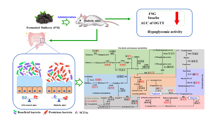 桑椹富含花青素、膳食纤维等降糖活性物质,前人研究报道发现,上述活性物质调控肠道菌群,维持肠道稳态的功能,但具体的作用机制尚不明确。基于此,本研究基于16S rDNA等手段分析了桑椹2型糖尿病小鼠肠道菌群的影响,发现其能精准调节糖尿病模型小鼠的肠道微生态:显著增加乳酸菌、双歧杆菌、阿克曼氏菌等有益菌丰度,抑制埃希氏菌-志贺氏菌、螺杆菌等有害菌增殖。为了进一步阐明其作用机制,团队从解析肠道菌群关键代谢物短链脂肪酸合成途径展开研究,结果表明桑椹主要通过上调肠道菌群产丙酸和丁酸途径关键酶的表达来助力宿主糖代谢稳态的恢复。上述研究对桑椹的加工和其“止消渴”提供一定的理论支撑。