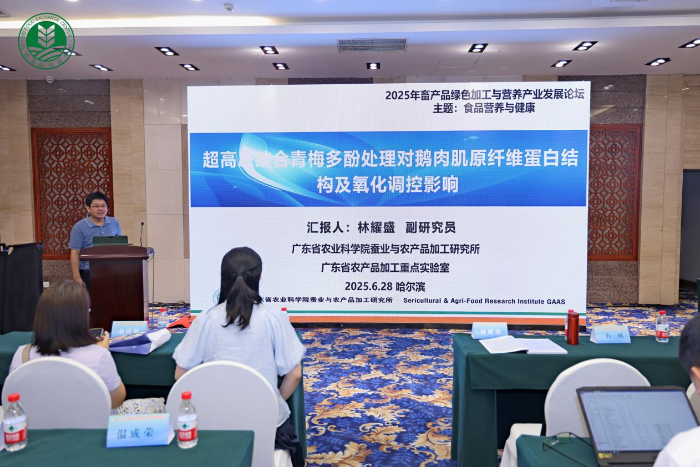 6月27-29日,由东北农业大学主办的“2025年畜产品绿色加工与营养产业发展论坛”在黑龙江省哈尔滨市举办,本次论坛以“食品营养与健康”为主题,来自50多家高校、科研单位和企业的400多位行业专家和技术人员参会。与会代表聚焦畜产品加工、肉类食品加工等重点产业科技与人类健康议题,围绕行业、产业和区域发展的技术问题,开展深入的交流和研讨。加工所畜禽加工团队程镜蓉副研究员和林耀盛副研究员参会,并与同行专家和企业代表进行了深入交流。
