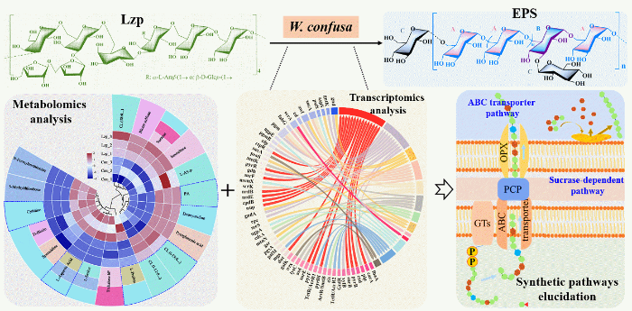基于研究团队前期发现荔枝多糖可以显著促进融合魏斯氏产胞外多糖活性,为了进一步阐明其具体的作用机制。通过甲基化、核磁等分析手段鉴定了胞外多糖的结构,其为以→6)-α-D-葡聚糖为主链的同型多糖。并进一结合转录组和代谢组等分析手段,发现经荔枝多糖处理后,其主要调控19种差异代谢物参与ABC转运体、淀粉代谢等通路,其中荔枝多糖水解生成葡萄糖、半乳糖/阿拉伯糖通过糖酵解、Leloir途径和磷酸戊糖途径转化为UDP-葡萄糖,显著提升EPS合成底物供应。转录组分析揭示60个差异表达基因,包括上调的msmX、ugpA等ABC转运蛋白基因,以及sacA等蔗糖合酶基因,协同促进前体物质运输和胞外组装。此外,荔枝多糖还可以通过调节pyrB等嘧啶代谢基因影响核苷酸合成,间接支持EPS聚合过程,展现“代谢-转运-转录”三级调控网络。该研究为果蔬多糖在食品工业中的功能化应用提供了理论支撑。