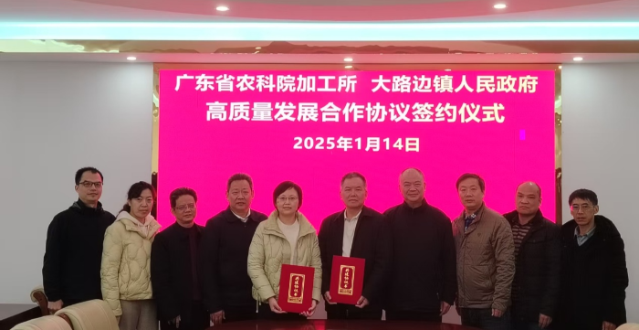 为深入实施“百千万工程”,推动乡村产业高质量发展,科技支撑连州市大路边镇稻米、南药等深加工产业,1月14日,加工所与连州市大路边镇举行高质量发展合作签约仪式。广州市黄埔区农业农村局驻大路边镇帮镇扶村工作队队长、大路边镇镇委副书记廖锦波,大路边镇常务副镇长周卫华,院合作部六级职员曾祥山,我所党委书记姚文山,粮油加工团队邓媛元研究员和青年科技骨干周鹏飞博士,以及清远分院驻点工作人员等参加活动。签约仪式由工作队长廖锦波主持。