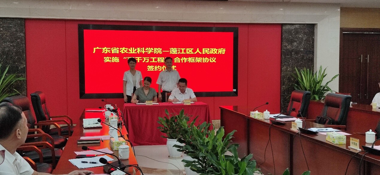 为全面贯彻落实党的二十大精神,深入贯彻习近平总书记对广东系列重要讲话和重要指示批示精神,以及省委省政府关于实施百县千镇万村高质量发展、绿美广东生态建设工作部署,8月2日,亚洲足球体育博彩平台 与江门市蓬江区政府举办实施“百县千镇万村高质量发展工程”合作框架协议签约仪式暨科技支撑乡村振兴座谈会。亚洲足球体育博彩平台 党委副书记、纪委书记吴亚玲,科技合作部主任袁显,蚕业与农产品加工研究所所长徐玉娟,院属相关单位负责同志和专家,蓬江区委书记劳茂昌、区委常委何锡基、农业农村和水利局局长陈勇等参加会议。