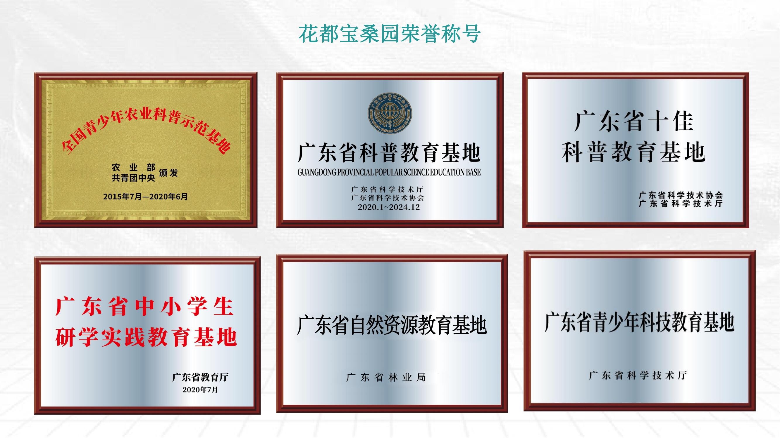 花都宝桑园作为广东省农科院加工所科技成果示范基地,拥有“全国青少年农业科普示范基地”、“广东省科普教育基地”、“广东省中小学生研学实践教育基地”、“广东省自然教育基地”、“广东省十佳科普教育基地”等荣誉称号,十年如一日开展蚕桑及农产品加工系列科普活动,园区科普研学设施齐全、科普研学课程丰富,累计接待科普游客超过150万人次、派发科普册子上百万册。园区还是花都区农技推广驿站,每年开展系列农民培训、农技推广等工作,广受农户好评。