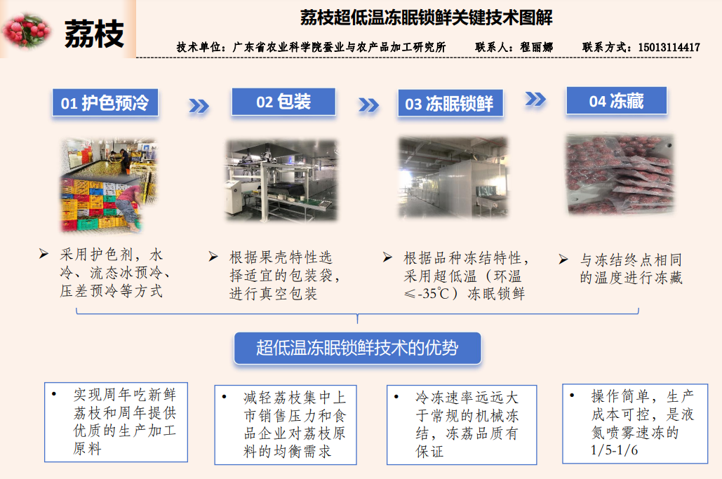 国内外在荔枝保鲜方面,以冷链为基础,现有的物理化学保鲜方法,保鲜期主要还是以天为计量单位,如何实现周年吃新鲜荔枝和周年提供优质的生产加工原料?减轻集中上市销售压力和食品企业对荔枝原料的均衡需求,需要超低温冷冻锁鲜技术的加持,达到周年销售和周年生产的目标,增加产业经济效益。主要采用的技术和拟解决的问题如下: (1)护色预冷前处理技术:采用护色保脆剂,进行杀菌钝酶和保证果壳硬度,并与冰水、流态冰、压差等预冷相结合起来,同步进行,节约时间;(2)真空包装:根据不同品种的包装特性,例如光滑果壳、带刺状突起果壳等,选用不同厚度、不同传热特性的包装袋,进行真空包装,避免贮藏过程中和解冻后的酶促褐变;(3)冻眠锁鲜:选用食品级低温冷冻媒介,冰点低于-35℃,根据不同品种(果壳传热特性、果实大小等)的冻结特性,选用适宜的冻结环温进行速冻,快速达到冻结终点温度;(4)冻藏:以荔枝冻结终点温度为贮藏环温,进行长期冻藏,避免冻藏过程中的温度波动引起的重结晶现象,保证冻藏期品质。