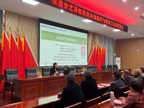 3月14-15日,徐玉娟研究员一行前往永康市、武义县开展蚕桑产业考察调研与技术指导服务,组织了现场研讨会及永康示范县果桑高效栽培与深加工技术培训会,徐玉娟研究员做了《桑果全产业链关键技术》专题培训,详细介绍了桑果营养功能价值及由桑果精深加工产业趋势及健康食品开发情况,团队聚焦品种创制、技术突破、产品创制、工程化应用等方面构建的桑果全产业链技术体系及产业化系列成果。