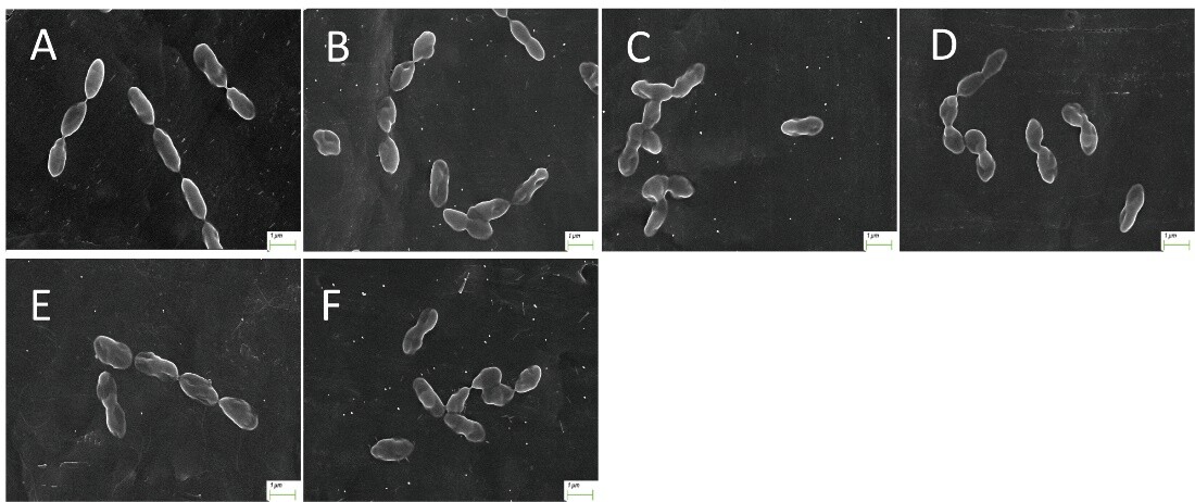 图1.AgNP处理后猪链球菌的形态。(A)对照,(B)6.25μg/mL,(C)12.5μg/mL,(D)25μg/mL,(E)50μg/mL,(F)100μg/mL。