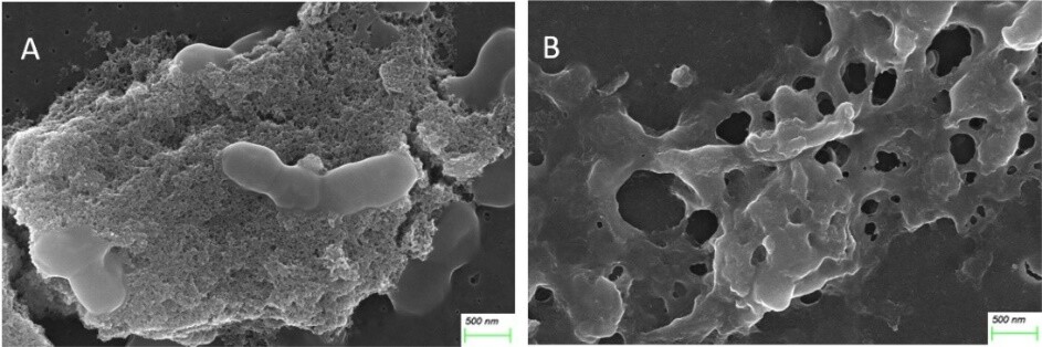 图2.AgNPs破坏了生物膜结构。(a)处理组。(B)25 μg/mL AgNPs 处理组。
