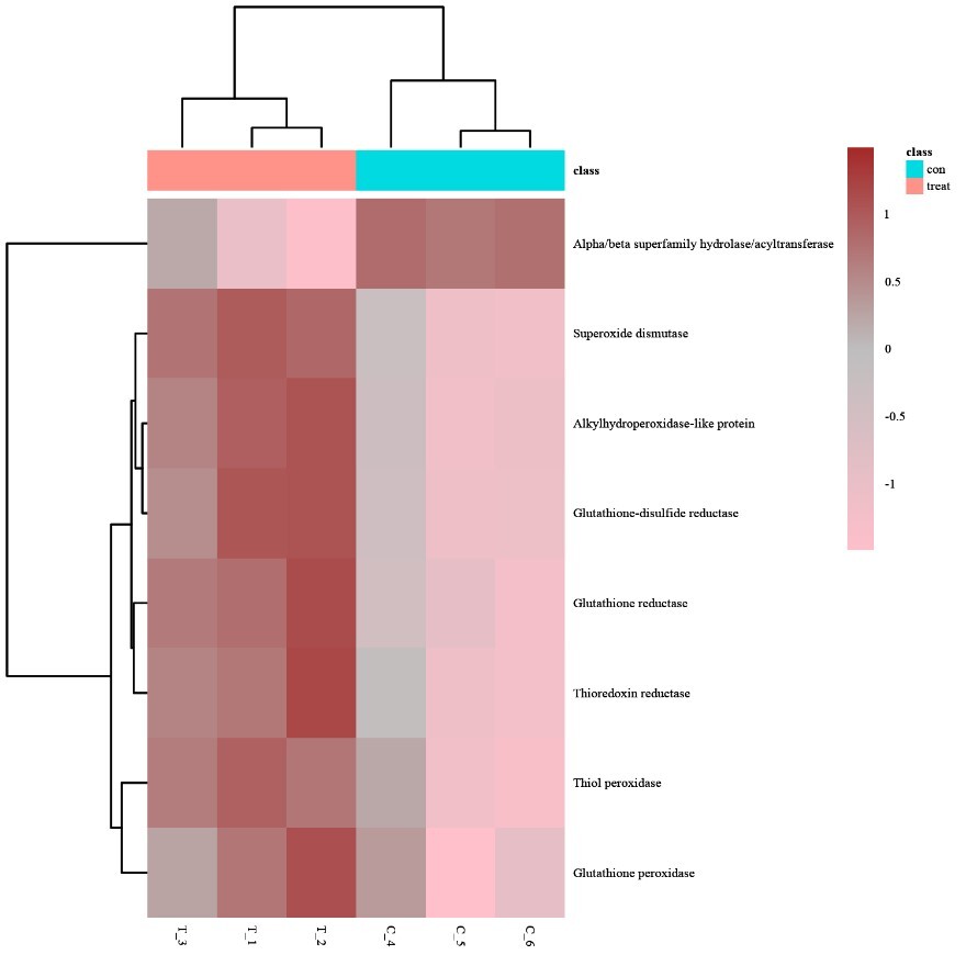 图3 AgNP处理样品和对照样品之间抗氧化活性蛋白的热图;粉色表示下调,棕色表示上调,灰色表示无明显变化。