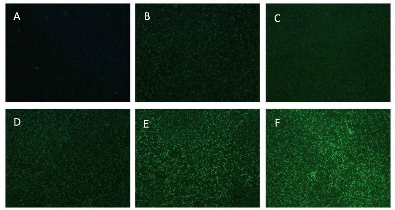 图4.在荧光显微镜下,AgNP处理的多重耐药猪链球菌在不同浓度下ROS产生的变化,放大倍率为×400。